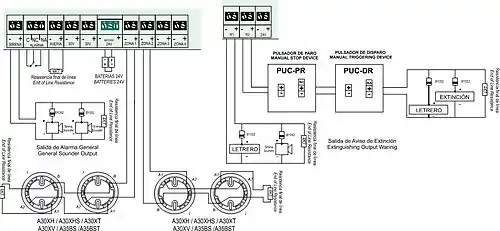 - Sistema convencional: estas centrales tienen zonas que conectan por cable desde 1 mm hasta 2,5 mm a los detectores y pulsadores. Generalmente el cableado puede extenderse hasta 800 metros o 1200 metros, según el tipo de cable, y tiene una resistencia al final de la zona.