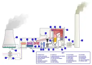Una central eléctrica de carbón convierte la energía química almacenada en carbón sucesivamente en energía térmica, energía mecánica y, por último, energía eléctrica. El carbón se pulveriza generalmente y luego se quema en una caldera de carbón pulverizado. El calor del horno convierte el agua de la caldera en vapor, que luego se utiliza para girar turbinas que giran generadores. En comparación con una central térmica que quema otros tipos de combustible, se requiere el procesamiento de combustible específico de carbón y la eliminación de cenizas.