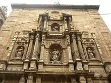 La fachada de la iglesia, labrada sobre un gran muro adosado a los pies del templo, como si de un gran retablo se tratara, habla de la evolución de un esquema que con más acusados ingredientes renacentistas se había planteado en San Miguel de los Reyes. Consta de tres cuerpos superpuestos en forma decreciente.