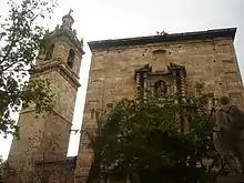 A la izquierda de la fachada se alza la torre campanario, comunicada con el templo a través de un paso de planta trapezoidal que formó la antigua capilla de San Elías.