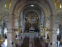 La basílica tiene tres naves con cúpula de media naranja en el crucero; la nave central se cubre con la bóveda principal de cañón reforzada por arcos fajones y cúpulas elípticas cubren las naves laterales.[2]