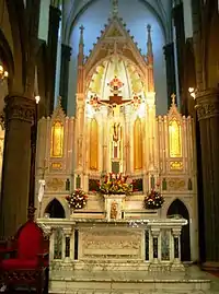 La primera parte de la iglesia fue inaugurada el 29 de mayo de 1932, y la etapa final de construcción se desarrolló entre los años 1938 y 1950. Fue consagrada el 20 de enero de 1951 por el arzobispo Luis Chávez y González. El templo mide 64 metros de largo por 52 de ancho, y contiene mármol de Carrara en el piso, los altares y el vía crucis. La cruz del altar mayor, que se ubica en el centro, se encuentra ornamentada con plata. De acuerdo a la tradición, fueron los mismos parroquianos quienes llevaron al templo varios utensilios de dicho metal, como tenedores, cucharas y tazones, los cuales fueron fundidos y de los que se obtuvieron 180 libras; además, el altar del presbiterio es una réplica de La Última Cena, y fue elaborado en los talleres de la casa Lucas Arrighini de Pietra Santa (Lucca, Italia).[6][13]En la actualidad el templo se encuentra cercado por comercio informal,[14]que incluye la venta de hierbas medicinales, remedios caseros y «servicios» de ocultismo y esoterismo.[15]