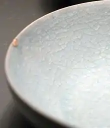 El esmalte era aplicado en varias capas,[12] y tanto en la parte superior e inferior de las piezas, por contraste con su rival la cerámica Ding, esmaltada solo en la parte superior y con un borde áspero sin esmaltar, a menudo cubierto con una abrazadera de metal. Las cerámicas Ru se mantuvieron alejadas de la superficie de la arcilla refractaria de la chimenea del horno estando apoyadas en tres o cinco pequeños acicates o púas, presumiblemente, de metal, que dejaron pequeñas manchas oval sin esmaltar nombradas «semillas de sésamo» en la parte inferior.[13][14] Los colores varían, y fueron divididos y clasificados por los eruditos chinos como «cielo azul», «azul claro» y «huevo-azul», en cada caso, utilizando la palabra china «Qing», que puede cubrir tanto la palabra azul como verde.[10]