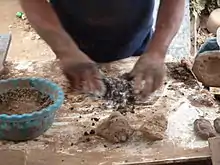 Los alfareros mexicanos suelen utilizar arcillas locales, las extraen ellos mismos y pagan a alguien para el transporte en burro o en camión. El tipo de mezcla utilizada varía dependiendo del lugar, desde el uso de pelusa de la anea en Metepec, a la arena en Acatlán de Osorio o la fibra del miraguano en Ameyaltepec para dar a la arcilla la consistencia adecuada y proteger el producto de agrietarse. En algunos casos se usa el feldespato. La arcilla natural viene en trozos, los cuales deben ser secados y luego triturados con un rodillo de piedra o mayal. Algunos alfareros ingeniosos en Metepec, ponen los trozos en la calle en frente de su casa y dejan que los coches pasen por encima. Otra manera de eliminar las impurezas y darle una calidad más fina, es disolviendo la arcilla en agua, de esta forma las impurezas y el sedimento más áspero se va al fondo de las cubetas.[24]