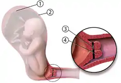 ![]() (1) Placenta; (2) Útero; (3) Banda cerclaje; (4) Cérvix | ||