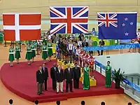 En una solemne ceremonia se procede al izamiento de la Bandera nacional, en una de las dos astas banderas colocadas al extremo de la pista atlética, de cara al palco de honor. Mientras, un coro, cantante o la pista reproducida en el sonido local, interpretan el Himno nacional.[14][15][16][12][13]