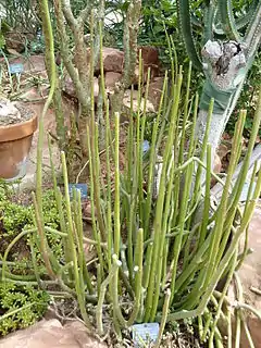 Planta suculenta con tallos erectos de color gris verdoso con forma de salchicha, con adelgazamiento en las juntas de un tallo con otro.