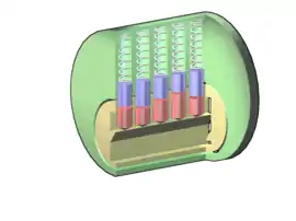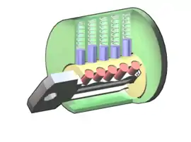 El tambor tiene una ranura recta conocida como "ojo" de la cerradura, técnicamente se llama "estría"; por un lado permite a la llave entrar en el tambor, y por otro puede tener una leva o una palanca que active el mecanismo para abrir la cerradura. El "ojo" de la cerradura, frecuentemente tiene unos muelles que evitan que las levas (rojos) caigan, haciendo la cerradura más resistente a "forzarla". En el tambor hay una serie de agujeros verticales, normalmente cinco o seis. Estos agujeros alojan levas de varias longitudes, que tienen el extremo redondeado para permitir que la llave se deslice fácilmente.