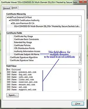 Una solución podría ser la de añadir cada nombre de host virtual en la extensión Subject Alternative Name (SAN),[4][5][6] el principal problema es que el certificado tiene que ser reeditado siempre que se agregue un nuevo servidor virtual (ver Seguridad de la capa de transporte § Soporte para servidores virtuales por nombre para más información).