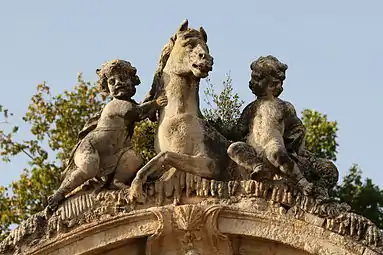 El jardín es una mezcla de jardín inglés y jardín de estilo formal francés, y alberga una gran fuente construida de miles de pequeñas conchas de mar y con una serie de querubines.
