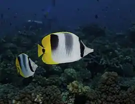 Es más conocido como pez mariposa del Pacífico de dos manchas, primero, porque habita el Océano Pacífico, y segundo, porque a simple vista se le notan, en su brillante cola amarilla, dos manchas muy oscuras, una de cada perfil, y tan oscuras que se notan a simple vista. Alcanza hasta 15 cm de longitud.[1]