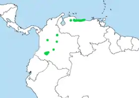 Se encuentra únicamente en las selvas de montaña en dos poblaciones disjuntas, una situada en el sur de los Andes de Colombia y la otra en la Cordillera de la Costa de Venezuela, donde es poco común en el suelo o a baja altura. Entre los 1400 y los 2600 m de altitud.[5]
