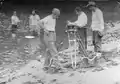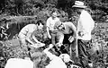 - Rodaje de la escena en que el protagonista de Chambú, Arturo Urrea está buscando oro en el río. El director, Alejandro Kerk; el asistente de cámara, Hernando González y el productor ejecutivo, Enrique Gutiérrez y Simón, observan la escena mientras el director de fotografía, Eduardo Botello, maneja la cámara tumbado en el suelo.