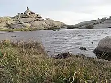 Se supone que la lagunilla de su cima ha dado origen al nombre del cerro, que significa en lengua del indígena (comechingón): 'Agua en la cabeza', es decir, 'Agua en la cumbre'.
