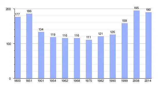 Los datos demográficos contemplados en este gráfico de la comuna de Charbonnières-les-Sapins[4] se han cogido de 1800 a 1999 de la página francesa EHESS/Cassini, y los demás datos de la página del INSEE.[5]