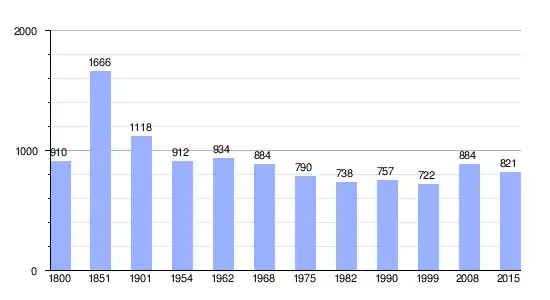 Los datos entre 1800 y 2015 son el resultado de sumar los parciales de las tres comunas que forman la nueva comuna de Charencey, cuyos datos se han cogido de 1800 a 1999, para las comunas de Moussonvilliers,[4]Normandel[5]y Saint-Maurice-lès-Charencey[6]de la página francesa EHESS/Cassini. Los demás datos se han cogido de la página del INSEE.[7]
