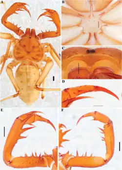 Habita en Australia.[1] El caparazón del macho descrito por Miranda, Giupponi, Prendini y Scharff en 2021 mide 3,20 mm de largo por 4,40 mm y el de la hembra 4,19 mm de largo por 5,94 mm.[2]