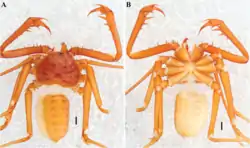 Habita en el continente africano.[1] El caparazón del macho descrito por Miranda, Giupponi, Prendini y Scharff en 2021 mide 2,60 mm de largo por 3,80 mm y el de las hembras de 2,80 a 3,65 mm de largo por 4,00 a 5,44 mm.[2]