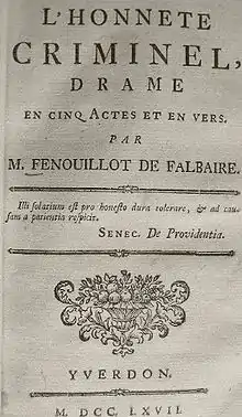 - L’Honnête Criminel, ou l'Amour Filial. Drama en cinco actos, publicado en 1767 y puesto en escena en París por el comediante francés M. de Villeroy el 2 de febrero de 1768; París, Théâtre de la Cour, Comediantes ordinarios de rey, 10 de julio de 1769. Disponible en línea en formato PDF</ref>