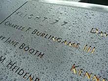En el National September 11 Memorial & Museum, el nombre de Burlingame se encuentra en la piscina sur, en el panel S-69.[6]