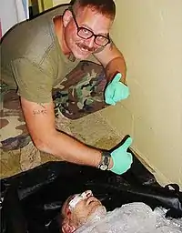 ![]() Graner posa sobre el cuerpo sin vida de Manadel al-Jamadi, un prisionero iraquí | ||