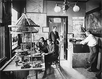 Lee De Forest fue aún más ambicioso, aunque Herrold más tarde afirmaría incorrectamente que «Ciertamente, De Forest no había pensado en una emisión».[5] Ya en junio de 1907, una revisión de la prueba de De Forest de su versión de un transmisor de arco de Valdemar Poulsen señaló que «el inventor cree que mediante el uso de cuatro formas diferentes de onda se pueden enviar tantas clases de música como se desee por los diferentes suscriptores».[6] De Forest hizo una serie de demostraciones musicales desde 1907 hasta 1910,[7][8][9] aunque en realidad no comenzaría las emisiones regulares hasta 1916, cuando los transmisores de tubo de vacío estuvieron disponibles.