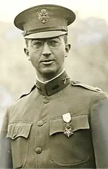 Rango y organización: Mayor, Ejército de los EE. UU., 1.er Batallón, 308.º de Infantería, 77.º División. Lugar y fecha: en Charlevaux, Binarville, bosque de Argonne, Francia; 2 a 7 de octubre de 1918. Entró en servicio en: Pittsfield, Massachusetts. Nacimiento: 20 de enero de 1884; Florence, Wisconsin. Órdenes Generales: Departamento de Guerra, Órdenes Generales No. 118, 2 de diciembre de 1918.