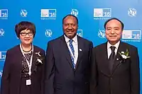 - A la izquierda: Aihua Jiang, al centro Charlot Salwai, y a la derecha: Houlin Zhao, Secretario General de la Unión Internacional de Telecomunicaciones en la Telecom World 2016.