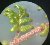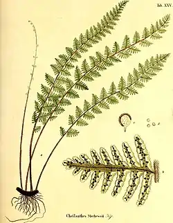 ![]() Ilustración a color de Cheilanthes pruinata; (a) hábito, (b) pinna, (c) soro, (d) esporas. | ||