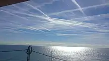 Las estelas de vapor, o senderos de condensación, ("contrails" en inglés) son "rayas de vapor de agua condensada creadas en el aire por un avión o cohete a gran altura".[70] La combustión de combustibles fósiles (como en los motores de pistón y de reacción) produce dióxido de carbono y vapor de agua. A grandes altitudes, el aire es muy frío por lo cual el aire caliente y húmedo del escape del motor se mezcla con el aire circundante más frío, haciendo que el vapor de agua se condense en gotitas o cristales de hielo que forman nubes visibles. La velocidad a la que se disipan las estelas depende completamente de las condiciones climáticas. Si la atmósfera está cerca del límite de saturación de humedad, la estela puede permanecer visible por un tiempo relativamente largo. Por el contrario, si la atmósfera es seca, la estela se disipará rápidamente.