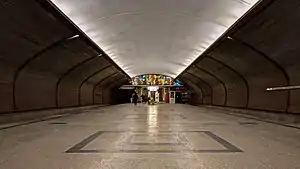 Los muros exteriores están cubiertos con paneles de metal corrugado. La estación está iluminada por lámparas escondidas detrás de la parte superior de los paneles. El final de las plataformas está decorado con vitrales, dedicados a diferentes deportes (escultor A. N. Kuznetsov) sobre las escaleras de salida.