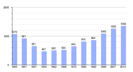 Los datos demográficos contemplados en este gráfico de la comuna de Cheux[4] se han cogido de 1800 a 1999 de la página francesa EHESS/Cassini, y los demás datos de la página del INSEE.[5]
