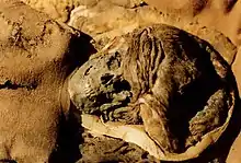 El carbono-14 la data aproximadamente del 1300 a. C., que es la misma fecha que los cimientos de una vivienda comunal de madera excavados en 1993. Estos aparecieron debajo de un pequeño túmulo funerario a 600 metros al noreste de la tumba. La casa medía unos 7,5 x 30 metros y posiblemente fuera su hogar. [2]
