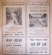 Los documentos más antiguos que dan cuenta de su funcionamiento datan de los años 1863 y 1874, en las ciudades de Camaná y Huánuco, respectivamente.[4] En Lima los primeros chifas se concentraron en la calle Capón.[1] El primer chifa de la capital peruana fue inaugurado formalmente el año 1921, fue conocido como «Kuong Tong» (Cantón),[7] y allí se acuñó el término «taypá»;[nota 1] perteneció al adinerado peruano Juan Iglesias o Chan Kay Chu, fundador del Tayouc Club y Cónsul de la China en Perú, estuvo ubicado en la citada calle Capón, que por ese entonces ya se conocía como el Barrio Chino de Lima.[11] Los primeros chifas limeños se convirtieron rápidamente en puntos de encuentro social de comerciantes y trabajadores chinos. Para atraer mayor clientela, recargaron la decoración de los locales utilizando ornamentos asiáticos y ofreciendo espectáculos musicales.[1]