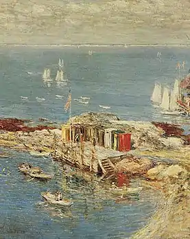 Durante los veranos, trabajaba en un lugar impresionista más típico, como Appledore Island, la más grande de las islas de Shoals frente a New Hampshire, entonces famosa por su colonia de artistas. La vida social en la isla giraba en torno al salón de la poeta Celia Thaxter que acogía a artistas y figuras literarias. El grupo era un "conjunto de personas alegres, refinadas, interesantes y artísticas... como una gran familia". Allí, Hassam recordó: "Pasé algunos de mis veranos más agradables... (y) donde conocí a las mejores personas del país".[7] Los temas de Hassam para sus pinturas incluían el jardín de flores de Thaxter, el paisaje rocoso y algunas escenas interiores, con sus pinceladas más impresionistas hasta la fecha. Al estilo impresionista, aplicó sus colores puros a lienzos sin imprimación y sin mezclar previamente.[7] Los artistas exhibían su trabajo en el salón de Thaxter y estaban expuestos a compradores adinerados que veraneaban en la isla. Thaxter murió en 1894 y, en homenaje, Hassam pintó su salón en La habitación de las flores.[7]