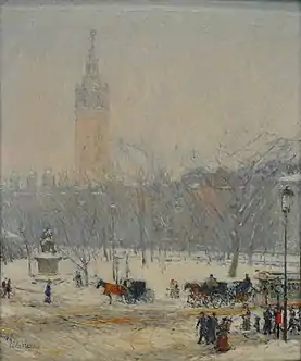 La pareja regresó a los Estados Unidos en 1889 y se instaló en Nueva York. Reanudó su estudio de ilustraciones y, cuando hacía buen tiempo, producía paisajes al aire libre. Encontró un estudio en la Quinta Avenida confluencia con la calle 17, una vista que pintó en uno de sus primeros óleos de Nueva York, Quinta Avenida en invierno. La calle de moda era transitada en esa época por carruajes y trolebuses tirados por caballos. Era uno de sus cuadros favoritos y lo exhibió varias veces.[7] Utiliza hábilmente una paleta oscura distintiva de negros y marrones (normalmente considerados "colores prohibidos" por los impresionistas estrictos) para crear un panorama urbano invernal, que Le Figaro elogió por su "carácter estadounidense". Para su Washington Arch in Spring (1890), en cambio, demostró una paleta de colores pastel brillante teñida de blanco similar a la que podría haber empleado Monet.[7]