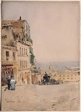 Hassam se había mudado a Francia para estudiar dibujo y pintura de figuras en la prestigiosa Académie Julian.[7] Aprovechó las clases formales de dibujo con Gustave Boulanger y Jules Joseph Lefebvre, pero rápidamente pasó al autoaprendizaje y descubrió que "La academia es la personificación de la rutina... [la formación académica] aplasta toda originalidad" de los hombres en crecimiento. Tiende a ponerlos en la rutina y los mantiene en ella", prefiriendo en cambio, "mi propio método en el mismo grado".[7] Sus primeras obras parisinas fueron escenas callejeras, empleando una paleta mayoritariamente marrón. Envió estas obras de regreso a Boston y su venta, combinada con la de las acuarelas más antiguas, le proporcionó ingresos suficientes para sostener su estancia en el extranjero.[7] En el otoño de 1887, Hassam pintó dos versiones de Grand Prix Day, empleando un revolucionario cambio de paleta. En este cambio dramático de técnica, había colocado colores más suaves y difusos en el lienzo, de forma similar a los impresionistas franceses, creando escenas llenas de luz, hechas con pinceladas más libres. Probablemente se inspiró en las pinturas impresionistas francesas que vio en exposiciones, aunque no conoció a ninguno de los artistas. Hassam eventualmente se convirtió en uno del grupo de impresionistas estadounidenses conocido como "Los Diez".[9]