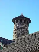 El final de la chimenea por encima del tejado es cilíndrico o en tronco de cono. Está construida en el mismo material, generalmente de travertino, localmente llamado tosca. Las aberturas para la evacuación del humo están delimitadas por piedras planas llamadas lajas, dispuestas en paralelo o inclinadas dos a dos, sobre una o dos filas superpuestas (a la manera de un «castillo de naipes»). Tardíamente se utilizaron también ladrillos a tal efecto. Una piedra plana circular finaliza el conjunto sobre las lajas. Finalmente la cumbre esta coronada tradicionalmente por una piedra, esculpida en forma de personaje o a veces de objeto (como una cruz) con el objetivo de alejar brujas y malos espíritus (el espantabrujas).