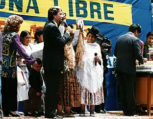 Así como las cholas han conquistado el derecho de vestirse como decidan al acceder a espacios antes vedados, también se recorre el camino inverso, mujeres que adoptan la vestimenta con motivo de celebraciones,[58] acceso a fuentes laborales[59][60] o legitimación como personajes representativos de su comunidad frente a los procesos políticos atravesados por el país.