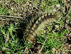 Las orugas son más vistosas que los adultos y pueden observarse entre noviembre y abril. Con una densa pilosidad de colores amarillos y blancos y con pinaculum rojos sobre el cuerpo negro,[1] se desplazan sobre el suelo y se alimentan de especies herbáceas, como Nardus stricta, Festuca y Anthoxanthum aristatum, pero también de algunas otras plantas bajas, como Hypochaeris radicata.
