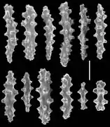 Las escleritas son de diversa forma según su ubicación en la colonia: las del cenénquima, o tejido común que recubre la colonia, son principalmente husos robustos, radiados, y formas ovoides con tubérculos muy variables, de entre 0.06-0.24 mm de tamaño; y los pólipos cuentan con husos y varillas muy tuberculosos, de 0.04 mm–0.09 mm de tamaño. Invariablemente, las espículas de la corteza axial son de color naranja-rojo, mientras que las de los pólipos son sin coloración.