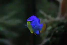Los machos pueden llegar alcanzar los 8,5 cm de longitud total.[1] Las hembras no sobrepasan los 6,5 cm. Perciforme, de forma alargada. Su coloración es azul eléctrico. Las hembras y los machos jóvenes poseen una mancha negra en la base de la aleta dorsal. En el caso de los machos, de adultos la pierden y colorean de amarillo o naranja su aleta caudal.
