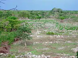 ![]() Vista del área donde posiblemente estuvo el mercado en el centro de Chunchucmil, Yucatán, México | |