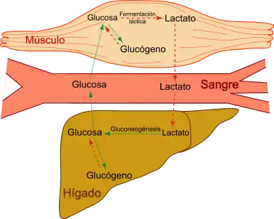 Durante el trabajo muscular, en presencia de una gran actividad glucogenolítica anaeróbica, se producen grandes cantidades de lactato, que difunde a la sangre para ser llevado al hígado. Ello es debido a que las células musculares carecen de la enzima glucosa-6-fosfatasa, por lo que la glucosa fosforilada no puede salir a la circulación. El lactato en el hígado es convertido nuevamente en glucosa por gluconeogénesis, retornando a la circulación para ser llevada de vuelta al músculo.