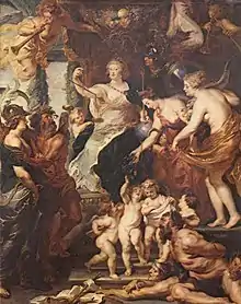 Esta pintura conmemora el control del gobierno por parte de María como regente, promoviendo a la vez un plan de paz a largo plazo en Europa mediante el matrimonio entre casas reales,[53] enlazando Cupido y Juno dos palomas sobre una esfera dividida como símbolo de paz. María esperaba que su hijo Luis contrajese matrimonio con la infanta Ana de España y que su hija Isabel se casase con el futuro rey Felipe IV con el fin de establecer una alianza entre ambos países,[54] siendo estas uniones una de las partes más significativas de su reinado puesto que la paz en Europa era su mayor objetivo.[55] El consejo de los dioses es una de las obras menos comprendidas de la colección. La pintura representa la conducta de María y el cuidado con el que supervisa su reino durante la regencia, como por ejemplo su control sobre las rebeliones y los desórdenes del Estado. El cuadro sugiere al mismo tiempo que María persuadió las políticas e ideales de Enrique hasta su muerte.[56] Los temas de la pintura están situados en un decorado celestial el cual no muestra un lugar, tiempo o acontecimiento concretos, estando la escena plagada de una significativa variedad de figuras mitológicas, lo cual dificulta el establecer el tema de la obra. Entre las figuras mitológicas se hallan, en la parte inferior, Apolo y Palas, quienes combaten y superan vicios tales como la discordia, el odio, la furia y la envidia, mientras que en la parte superior figuran Neptuno, Pluto, Saturno, Hermes, Pan, Flora, Hebe, Pomono, Venus, Marte, Zeus, Hera, Cupido y Diana.[57] Todas estas figuras actúan como alegorías del pacífico gobierno de María sobre Francia.[58]