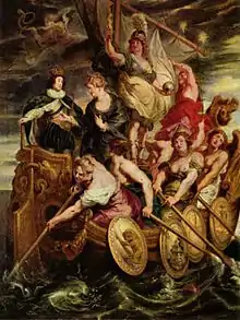 Él (Rubens) rodeó su María de Médici con tan ricas anexidades que en todo momento parece casi empujada hacia el fondo. Considere, por ejemplo, «El desembarco en Marsella», donde todo el mundo tiene sus ojos sólo para las voluptuosas Náyades, para desventaja de la reina quien está siendo recibida con los brazos abiertos por Francia.[33]