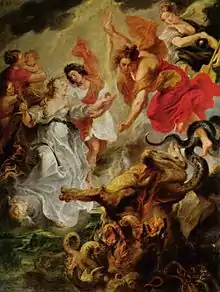 En la pintura, Luynes es el chivo expiatorio que sufre el castigo divino y es arrojado al abismo del infierno, asumiendo así toda la culpa de la animosidad entre Luis XIII y su madre.[85] El rey, retratado como un adulto, es representado como Apolo, si bien la muerte de la hidra no se debe a él, como cabría esperar, sino a una visión amazona de Providencia.[86] Con la eliminación de la balanza que portaba en un esbozo previo lo cual la habría conectado con Luis XIII, la figura mostrada representa a una entidad la cual no cuenta con la ayuda de Luis a la hora de matar al adversario, mostrándose el monarca ajeno y despreocupado.[87] María, no obstante, emerge como una madre amorosa preparada para perdonar todo el mal y sufrimiento padecido.