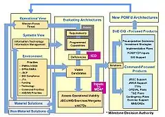 La figura representa la vida de la arquitectura, como ésta evoluciona y muestra el proceso que la arquitectura apoya en el desarrollo, el análisis y la evolución de la arquitectura implementada. En esta ilustración, la vista operacional se usa para manejar los requerimientos que son evaluados contra los sistemas de vista. Las deficiencias de operación se derivan del análisis y la indefinición de candidatos viables. Estos candidatos pueden tomar la forma ya sea de soluciones materiales o no materiales y se remodelan dentro de los sistemas de vistas y vistas operacionales de la arquitectura. [5]
