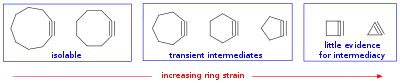 Debido a las importantes restricciones geométricas impuestas por la funcionalidad R–C≡C–R, los cicloalquinos más pequeños que el ciclodecino (C10H16) dan como resultado estructuras altamente deformadas. Mientras que el ciclononino (C9H14) y el ciclooctino (C8H12) son compuestos aislables (aunque fuertemente reactivos), el cicloheptino (C7H10), ciclohexino (C6H8) y ciclopentino (C5H6) solo existen como intermedios de reacción transitorios o como ligandos que se coordinan con un centro metálico. [3] Hay poca evidencia experimental que respalde la existencia de ciclobutino (C4H4) o ciclopropino (C3H2), además de estudios que informan el aislamiento de un complejo de osmio con ligandos de ciclobutino. [4] Los estudios iniciales que demostraron la intermediación transitoria de los cicloalquinos de siete, seis y cinco carbonos se basaron en atrapar el alquino de alta energía con un compañero de reacción adecuado, como dienos cíclicos o compuestos diazo para generar productos de Diels-Alder o diazoalcano de cicloadición 1,3-dipolar, respectivamente. [5] Los cicloalquinos estables de anillos pequeños se han aislado posteriormente en complejos con varios metales de transición como el níquel, el paladio y el platino . [6] A pesar de que durante mucho tiempo se consideraron curiosidades químicas con aplicaciones sintéticas limitadas, trabajos recientes han demostrado la utilidad de los cicloalquinos tensos tanto en la síntesis total de productos naturales complejos como en la química bioortogonal . [7] [8]