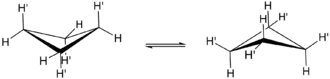 Los enlaces están en posición alternada. Los ángulos de enlace se desvían desde los 109º a los 88º.1 El esqueleto de la molécula es un rombo ligeramente plegado, los cuatro átomos de carbono del ciclobutano no son coplanares, en lugar del anillo típico adopta una configuración doblada o "fruncida".[2] Uno de los átomos de carbono forma un ángulo de 25° con el plano formado por los otros tres carbonos. De este modo algunas de las interacciones eclipsantes se reducen. La conformación también se conoce como de "mariposa". Interconvierten equivalente conformaciones fruncido: